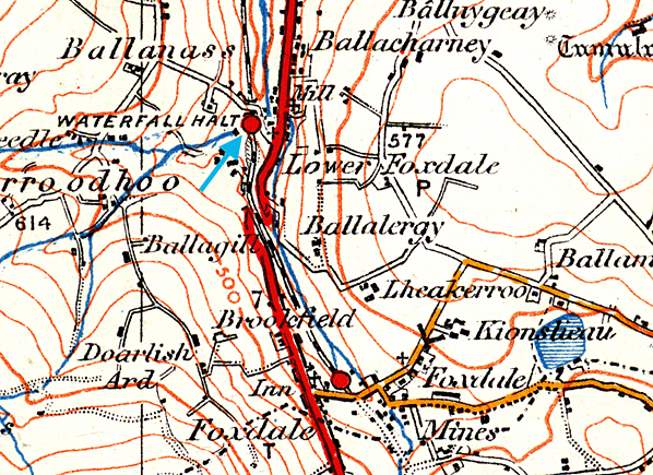 Notes: Waterfall Station which served the village of Lower Foxdale opened along with the Foxdale Railway on the 17.8.1886. It served trains running between Foxdale and St Johns MNR with some going on to Ramsey in the early days. Although owned by the Foxdale Railway Company the line was