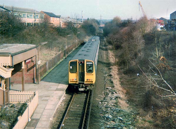 A class 313 provides the shuttle service at Watford West station in March 1986, their