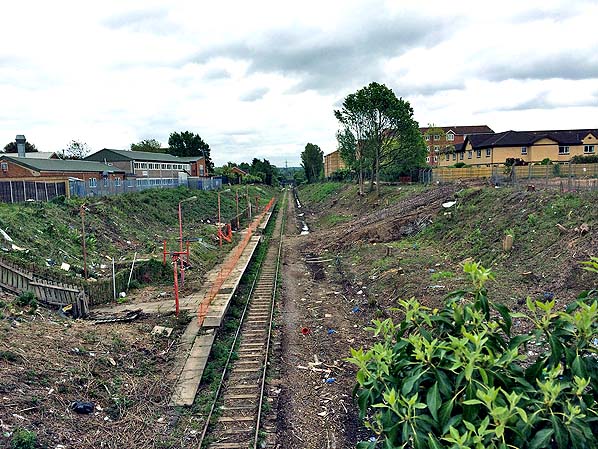 Watford West station looking east from Tolpits Lane bridge in May 2014.