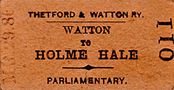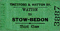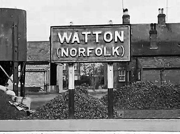 Photo by HC Casserley ![]() The station name board on the southbound platform in 1963. The board shows the station name as Watton (Norfolk). The station was originally called Watton but the Norfolk suffix was added 1 July 1923. This is usually done to avoid confusion with another station of the same name but there was no other Watton station. The coal yard is seen to the rear of the platform.