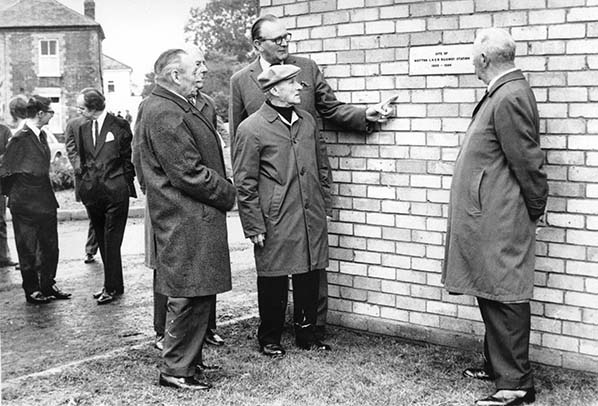 Photo from Julian Horn collection ![]() Unveiling a commemorative plaque on the industrial unit on the site of the railway station. Stanley Clarke the last station master is hidden except for his face. John Hill MP pointing at the plaque. The plaque survives in 2017, not quite covered by a tea stall!