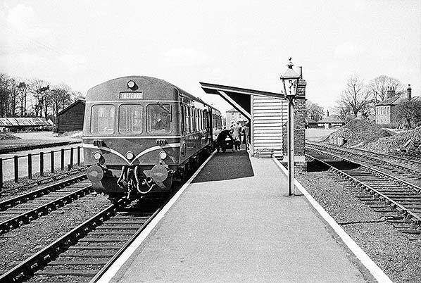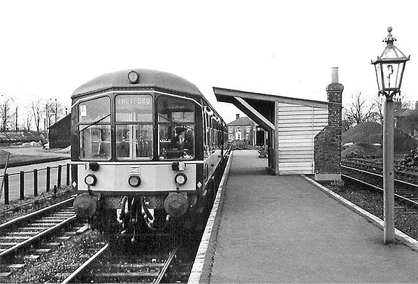 Photo from John Mann collection ![]() A few passengers have alighted from a two-car Metropolitan Cammell DMU at Watton. This afternoon train was from Swaffham to Thetford on 16 April 1964, just two months before closure.