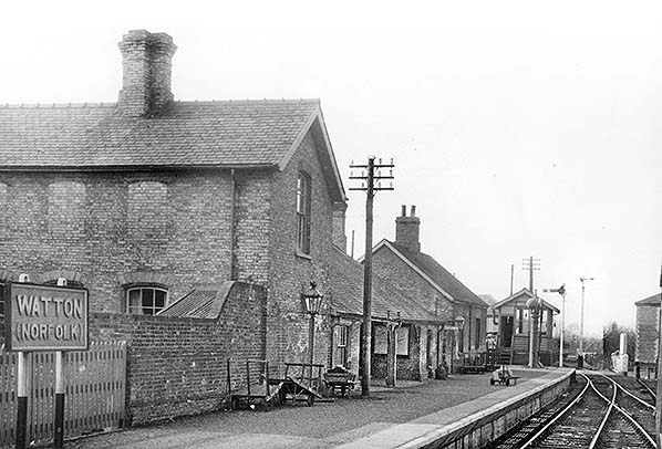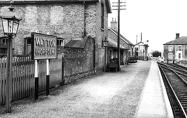 Photo by RM Casserley ![]() Looking south from the single-track level crossing at Watton station in March 1962.