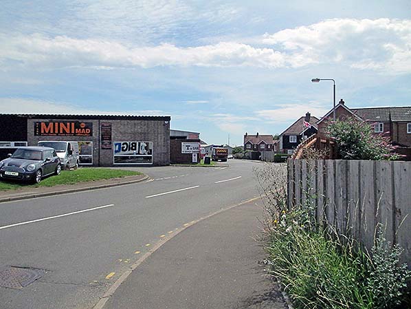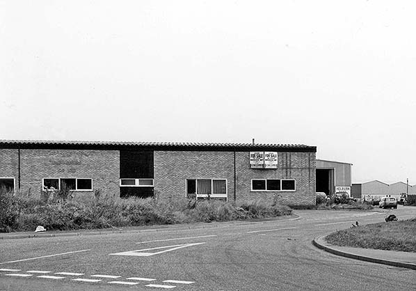 Photo from Julian Horn collection ![]() The industrial units at the junction with Norwich Road straddle the site of the platforms. This scene in 1982: fortunately in 2017 the vicinity is tidier - the end unit is occupied by a company selling used Minis which are displayed on the grassed area, now well maintained.
