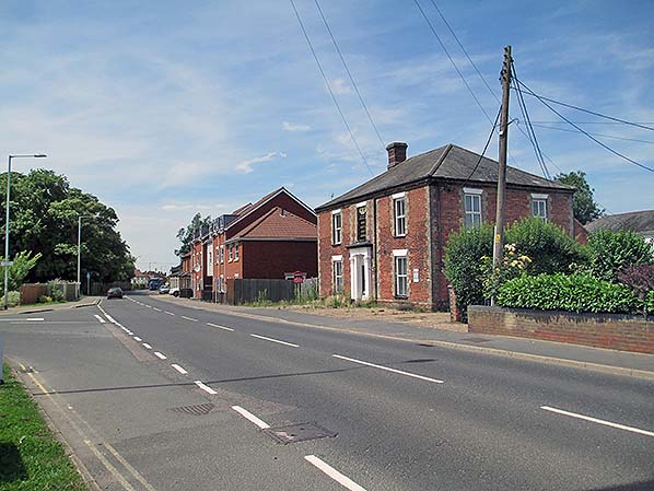 Photo by John Mann The former Railway Hotel in July 2017. The railway crossed the road at an angle emerging down the side-road on the left and crossed Norwich Road. The line was where the lower-roofed, nearest to the camera, part of the modern apartment now sits. Crossing gates protected the railway and road.