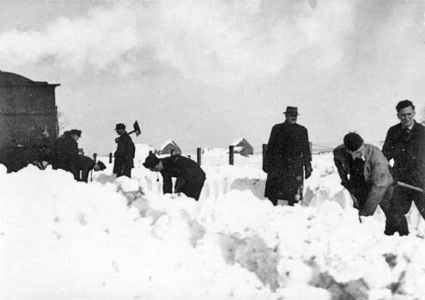Teams of men clear the line of snow in the harsh winter of 1947, supported by a J17 0-6-0.