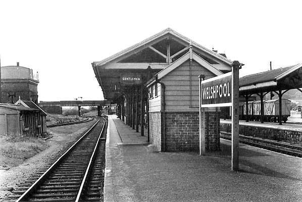 ![]() Photo by Ben Brooksbank ![]() A rail tour to the Talyllyn Railway is seen taking on water at the Welshpool station's down platform on 28 September 1957. Smartly dressed passengers have taken the opportunity to step out of the train and observe the activity. Copyright photo from the Mike Morant collection ![]() can be seen to the right. Photo from John Mann collection ![]() Copyright photo from the John Alsop collection ![]() Photo from John Mann collection ![]() Looking south-west along the down platform number 1 at Welshpool in the 1950s. Photo from John Mann collection