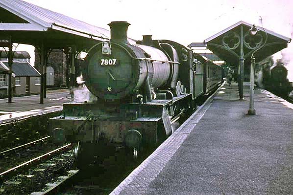 ![]() An up express service is seen at Welshpool stations platform 3 in 1962. At the head of the train is ex-GWR 4-6-0 Manor Class locomotive number 7809 Childrey Manor. At this time the locomotive was allocated to Oswestry locomotive depot. A local service can be seen in the bay platform.