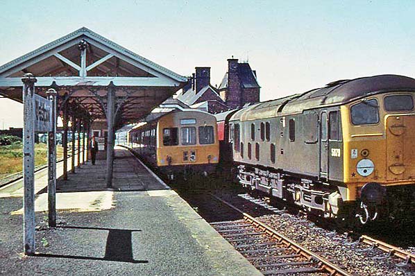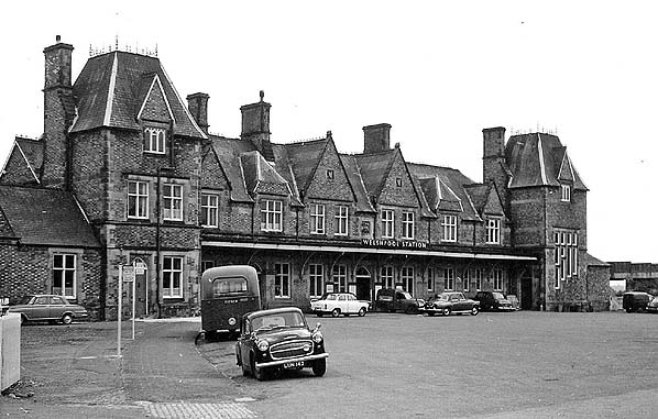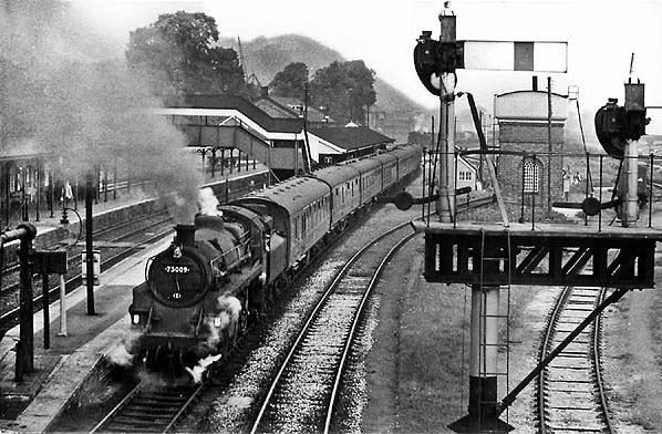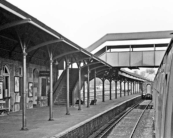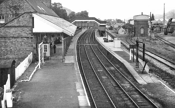 ![]() Welshpool station looking north-east in the 1960s. A down express is seen at platform 1.