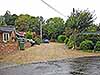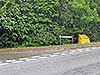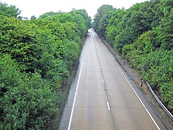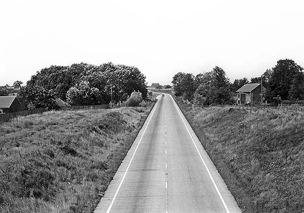 Photo by John Mann The site of the station looking west from the concrete over bridge that spans the A47 road which runs along the line of the railway at Wendling in September 2017. The up platform was on the left inside the tree line, the down platform approximately along the middle of the carriageway.