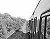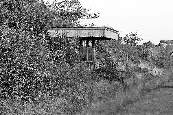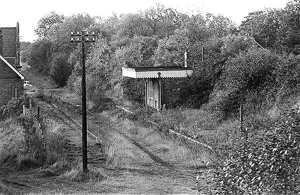 ![]() Wendling station looking east from the up platform in October 1975. The trackbed is becoming heavily overgrown obscuring much of the down platform. The supports for the running-in board are protruding through the bushes.