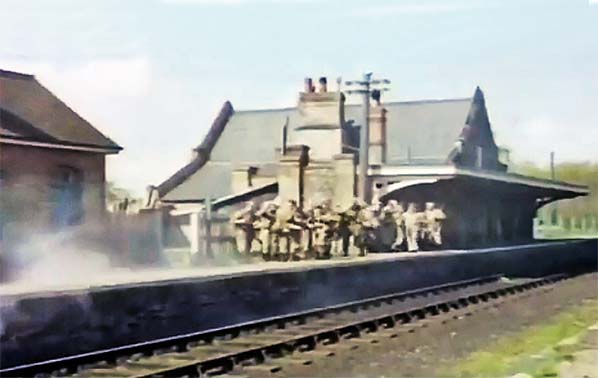![]() The Walmington on Sea Home Guard platoon are seen standing on the up platform at Wendling station during filming of Battle School in June 1969. The opening shot of the episode was taken from The Titfield Thunderbolt, a film made some 16 years previously. Stock footage was required as the location being used for their arrival could no longer be reached by train. The train pulls into the station on the left track of a 2-track station. The next scene depicts the Home Guard standing on the right platform of a single track line with the smoke of the train pulling away on the right hand side as seen here.