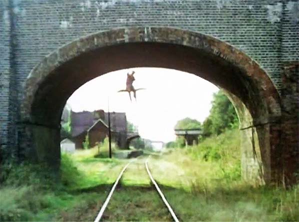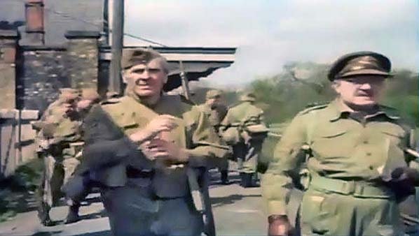 ![]() Captain Mainwaring is seen dangling from the road bridge in The Day the Balloon Went Up.