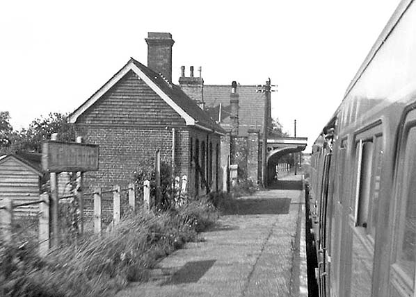 ![]() Station Name: WENDLING![]() A DMU stops at Wendling station on 3 September 1968. The line closed four days later. The platform is overgrown and, although not shown in the picture, the eastbound platform has lost its rails and the signal box closed. The building behind the platform is probably the goods lock-up.