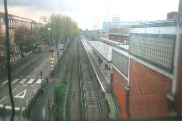 West Ham station seen seen through frosted glass in the passenger walkway December 2006 Photo by Nick Catford