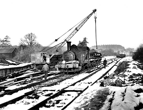 ![]() Track lifting is underway at West Hoathly station in January 1965.The locomotive is an ex-North London Railway Class 75 tank engine that was withdrawn from Rowsley Shed in December 1960. It was stored at Barrow Hill for two years before coming to the Bluebell in 1962. In 1964 it was hired by the demolition contractors for lifting the track between Ardingly and East Grinstead. It was later used again for rebuilding the same line when the Bluebell's northern extension was under construction. Photo by E Wilmhurst