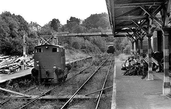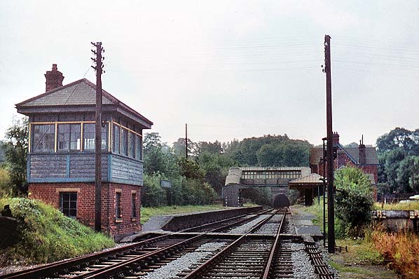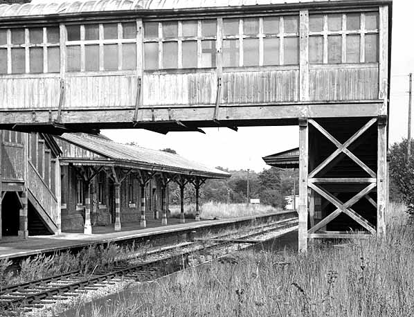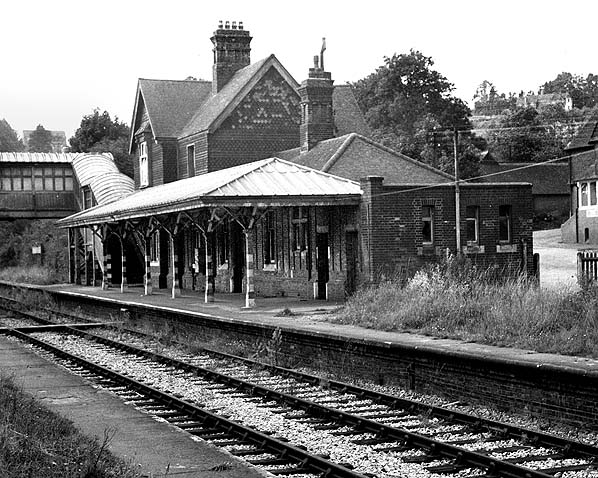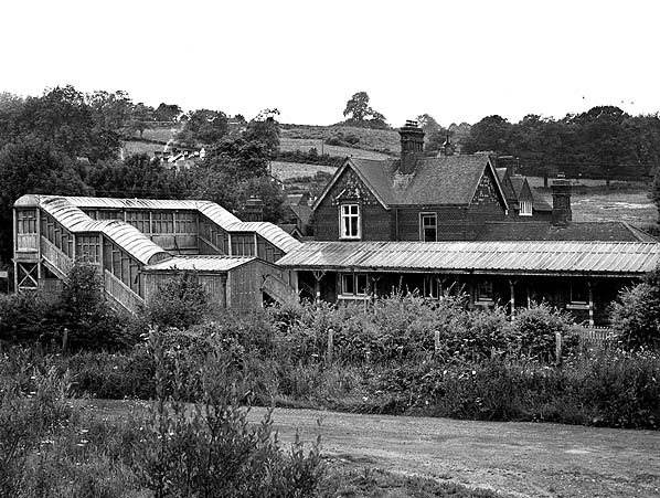 ![]() Looking north from the down platform at West Hoathly station in September 1961. This view clearly shows where the decorated valance along the edge of the canopies was cut away by