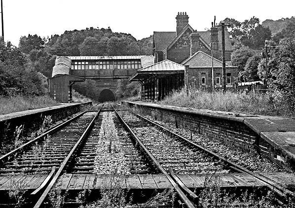Photo from John Mann collection ![]() West Hoathly station looking south towards Sharpthorne Tunnel in August 1960, two years and five months after closure. Apart from the rusty rails little has changed. A buffer stop alongside the cattle dock is seen on the right, The track in the goods yard has probably been lifted by this date, and five years after closure of the yard it is now very overgrown.
