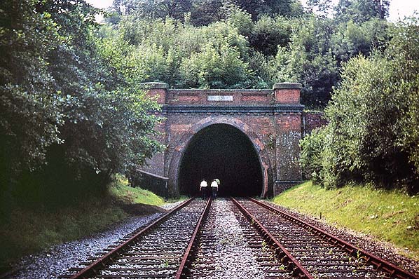 Photo by Ron Fisher from his Flickr photostream ![]() Looking south towards the north portal of Sharpthorne Tunnel in August 1960. The trackbed is surprisingly clear of any vegetation and the verge also appears to have been kept clear. Two people are seen heading into the tunnel.
