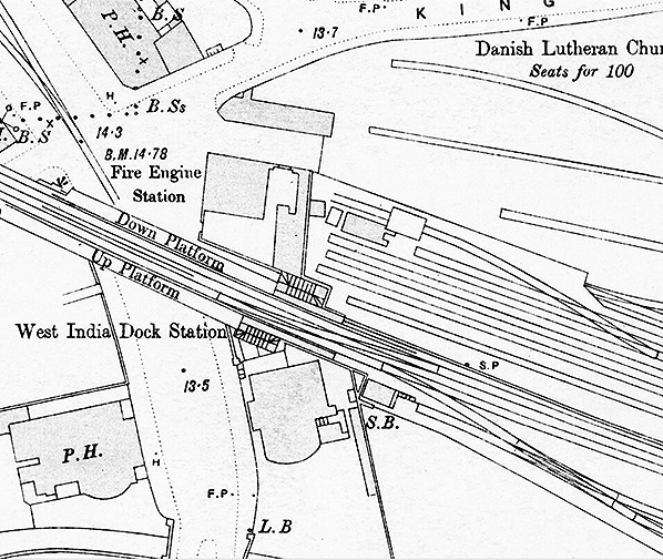 Notes: The platforms at West India Docks were of timber construction built onto the side of the viaduct. on the east side of West India Dock Road. The station was originally a two-storey structure incorporated into the viaduct with covered platforms at the upper level in a range crossed by another to produce a cruciform-plan building. The Great Eastern Railway altered the station removing the roof and the upper storey of the building and replaced the bridge over West India Dock Road in 1896–9.