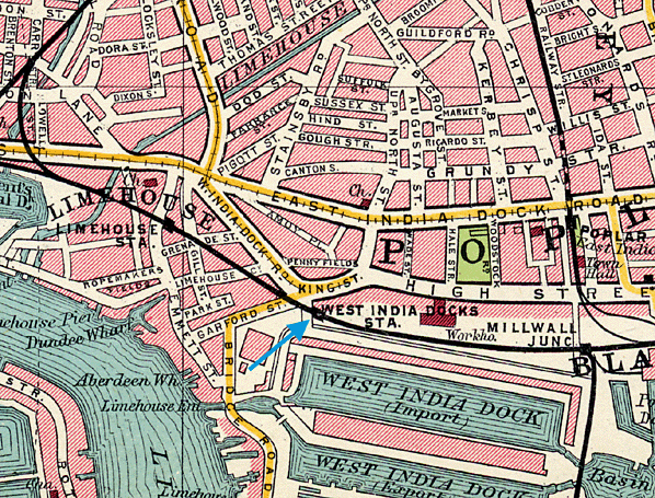 For other stations on the London & Blackwall Railway click on the station name: Fenchurch Street, Minories, Leman Street, Cannon Street Road, Shadwell & St. George's East, Stepney (East), Limehouse, Millwall Junction, Poplar (1st site), Poplar (2nd site) & Blackwall