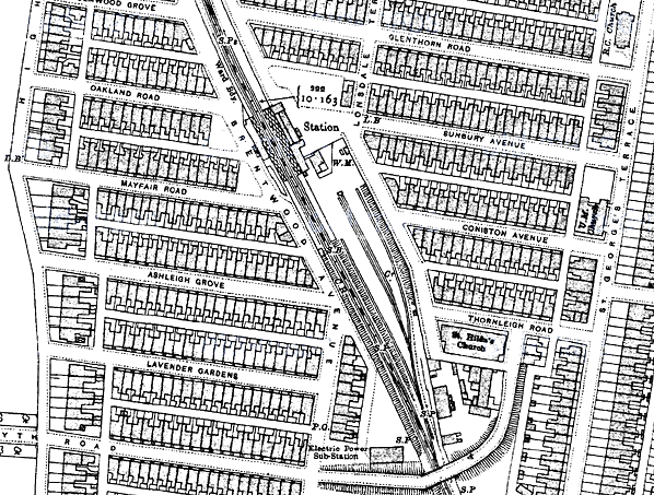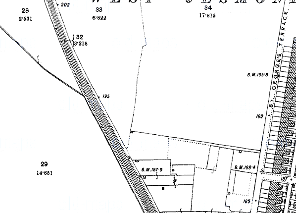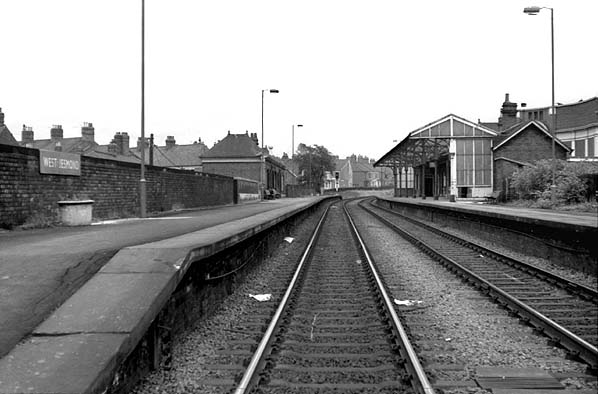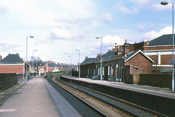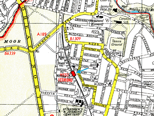 Note: Towards the end of the 19th century terraced housing, some of it of good quality, spread around the railway east of Newcastle Town Moor between Jesmond and Gosforth. The North Eastern Railway opened West Jesmond station on 1 December 1900 to serve this newly urbanised area. Its single-storey station buildings were a restrained version of the fashionable Domestic Revival style. Red brick was used in their construction, also for the walls along the rear of the platforms, instead of the customary fence.