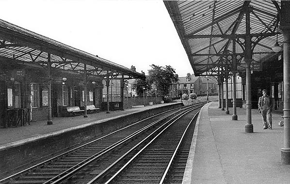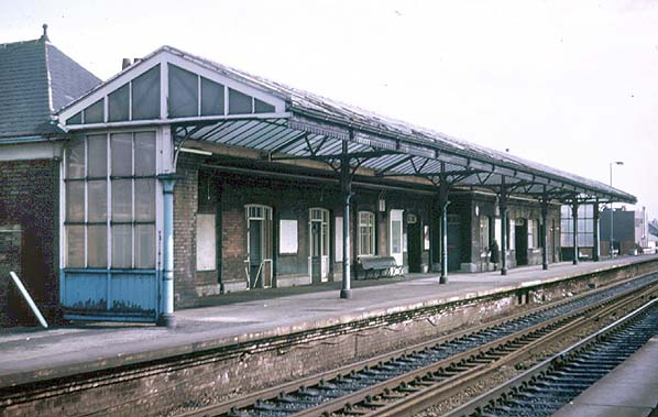 was a broad window. A small shop occupied much of the space between the central gable and the north pavilion. On the opposite platform a less elaborate building with waiting facilities was provided. A subway connected the platforms. Generous glazed ridged awnings (verandahs) protected each platform, and additional shelter was afforded by the glazed end-screens, typical of NER practice.