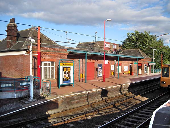 West Jesmond, looking south-east in July 2010. The main building, on the up platform, was fronted by a large awning until it was removed in the late 1970s. However the recessed area between the pavilions, and the former booking hall, still provide shelter for passengers.