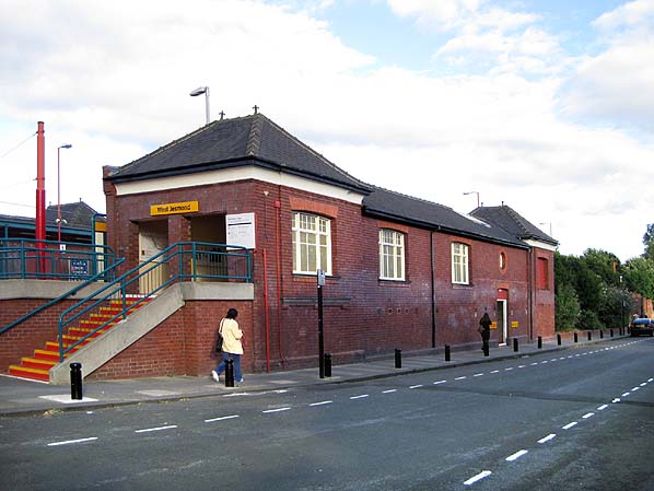 ![]() Exterior view of West Jesmond’s down platform building, looking south-east in July 2010. This structure complemented the design of the building on the opposite platform, but lacked the central gable. The original entrance to the platform and subway was at street level, towards the far end of the building. The stepped access and entrance in the foreground were added after British Rail relinquished control. Photo by Ali Ford