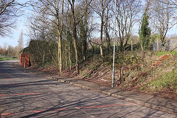 The steps to the platform still in place in March 2026 alongside where the bridge crossed over Crankwood Lane. This view looks west with the West Leigh and Bedford station site to the right.