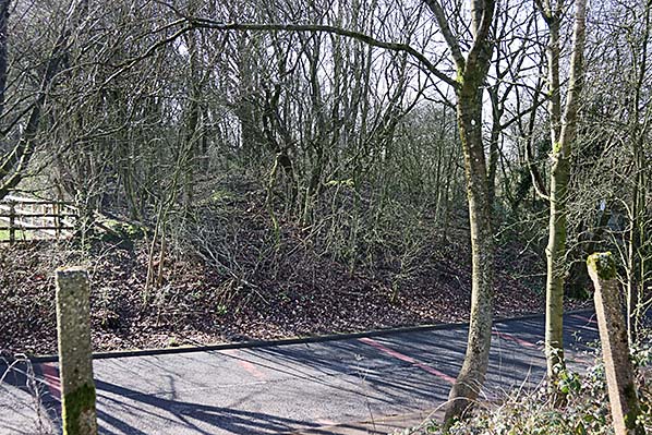 View south over Crankwood Lane with the railway embankment to the south of the site of West Leigh and Bedford station in March 2026.