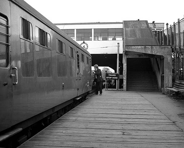 A DMU stands in the down platform at West Monkseaton station in May 1979. Buffer stops have been installed beneath the bridge, accompanied on the platform by a ‘Trains stop here’ sign. The line beyond was temporarily closed for Metro conversion work. Note the bars fitted to the windows of the carriage doors to prevent passengers from leaning out of them. This was done because of limited clearances on the Coast Circle line.