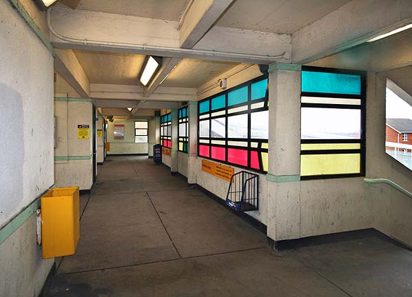 The refurbished bridge at West Monkseaton station in March 2009. The coloured glass is new and fits well in this Art Deco building. Photo Nick Catford