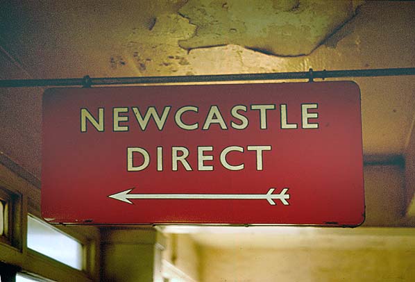 West Monkseaton passengers were permitted to travel either clockwise (via Wallsend) or anticlockwise (via Benton) to Newcastle. This sign points them to the up platform via Benton, a nine-mile journey as opposed to 11½ miles via Wallsend.