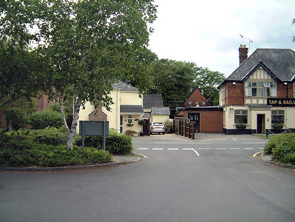 Site of West Moors station and level crossing looking west from the site of the down platform in June 2010 - the public house is the continuity with the c.1960s and 1968 photos - June 2010