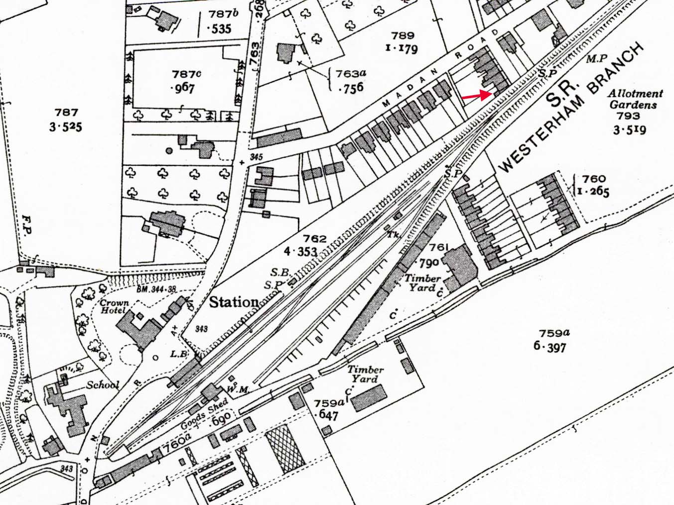 ![]() 1:2,500 OS map. By this date the engine shed had been demolished with only its low brick base remaining either side of the shed road. The letter box in the station forecourt has been relocated to the other end of the station building. The stationmaster's house is indicated. ![]()