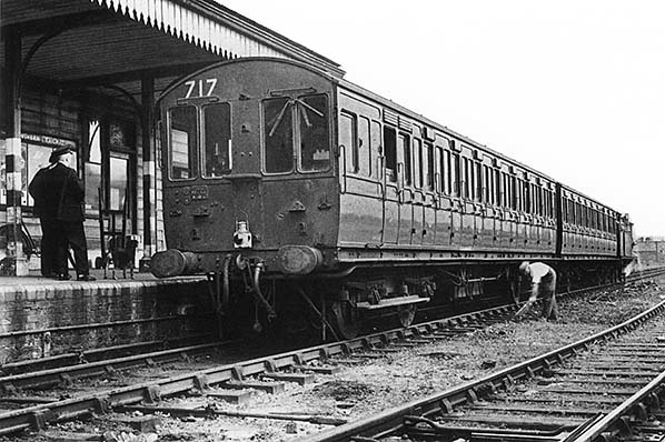 ![]() Push - Pull* set 717 at Westerham in 1947. The locomotive is believed to have been Class R 0-4-4T No.1671. Few details specific to set 717 have been found but it shows hallmarks of being of LB&SCR origin. These sets had an interesting history and ran originally either as single cars or with a locomotive sandwiched between a pair of driving trailers. The latter method was rather wasteful of resources. Eventually altered into the driving trailer + composite form seen above, following a number or reshuffles the composites finally inserted had began life in the one-time LB&SCR overhead electric units. Note that the locomotive is at the Dunton Green end; Southern Railway practice appears to have had Westerham branch trains either way around but in BR days trains generally had the locomotive at the Westerham end. Information supplied with the above photograph states that at the end of each day's service the Push - Pull trains had goods wagons coupled for returning to Dunton Green where they were detached and the train then continued in service to Tonbridge. Although this cannot be disproved at the time of writing, it is considered highly unlikely. The practice in BR days, at least, involved the passenger set being stabled overnight at Westerham while its locomotive detached and worked the goods to Dunton Green with the reverse applying in the early morning, with a goods trip back to Brasted before the locomotive returned to Westerham to take up passenger service. On the platform, note the alternate-colour painting on the canopy support columns. This had probably been applied during WWII as part of the ARP blackout contingency measures. [*Push - Pull, with the hyphen, was the Southern's version of the term for this method of operation. Other railway companies used variations such as 'Push & Pull', 'Pull & Push' or simply 'P&P'. The Great Western Railway, as always wanting to be different, used the words 'Autotrain' and 'Autocoach'. 'Motortrain' was yet another term used rather loosely from time to time.]