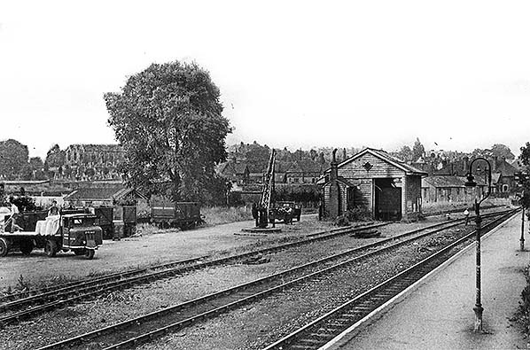 ![]() Westerham goods yard in August 1947. Apart from the small goods shed and dock at the western end of the site, this view shows the extent of Westerham's goods facilities which on this occasion held a reasonably amount of wagons. As was the case with most wagon-load goods traffic, much shunting and remarshalling was required during the course of a journey. Westerham's position close to London meant that it was often, especially with the advent of road motor transport, far more convenient to send goods by road unless goods needed to be sent to, or were coming from, much further afield. This should not be taken as a criticism of the Westerham branch though, as the same situation existed at many other locations. The open wagon nearest the camera on the back road siding, right, looks ancient even for 1947 and appears to retain a wooden bufferbeam. It may have been a private owner wagon. The open wagons, centre left, are carrying what look like sections of felled trees. Left of the crane the signal box and part of the station platform can be seen.