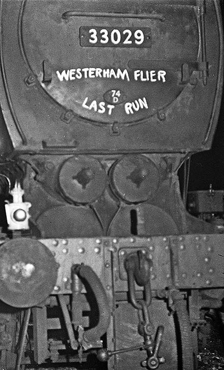 A close-up view of the front of the Bulleid Q1 at Westerham on 28 October 1961. As the type has been given an overview elsewhere, this view is useful for describing other details. Of note is the spelling of 'flier', it having been spelled 'flyer' on the Class H, No.31518. Which spelling is correct is a matter for some debate but 'flyer' is the usual spelling. Either side of 'Westerham Flier' can be seen the two extra brackets required for the Southern Region 6-disc/lamp headcode system. Also visible is the rather pesky bolt-and-clamp system for securing the smokebox door. This system was more familiar on Midland Railway locomotives but a number of Southern Railway classes also used it. On the Q1 class there were three more such fittings around the top of the smokebox door, resulting in an unbalanced appearance. The code 74D indicated Tonbridge shed. BR introduced this system in 1950 and it was based on the existing LMS system and the first number denoted the region, thus all Southern Region shedcodes began with '7'. The system was complex and included other sheds in the district of the main shed which had their own codes as well as 'sub sheds' which used the code of their parent shed. Prior to the introduction of the BR, LMS based, shedcode system a three-letter numeric code was used, with Tonbridge being 'TON' although the shed name was often painted in full on bufferbeams. There was thus a degree of irony when, in 1973, BR abandoned the alpha-numeric system and replaced it with a two-letter system which remains in use today. Shedplates, such as that seen on No.33029, were of cast iron and fixed to the locomotive by means of two bolts. They also appeared on diesel locomotives during the early years of that form of traction and could also appear on diesel multiple units, in this case fixed to the solebar where it usually went unnoticed by the public.