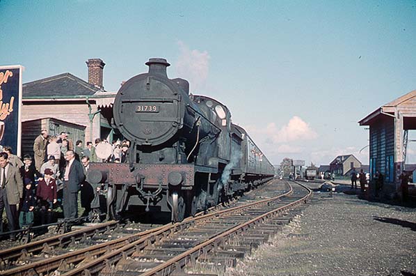 ![]() On the final day, the 3.01pm service hauled by No.31739 has arrived at Westerham with set 277. Note the large crowd of enthusiasts making the job of railway staff difficult. When the leading carriage is at the platform, quite why people thought it necessary to open a non-platform side door is a mystery. This photograph offers a better view of the Southern style of ground signal, left foreground. In this instance the signal operates in conjunction with the adjacent trap points, the purpose of which is to derail any locomotive or vehicle proceeding without authority. A similar signal controlled the