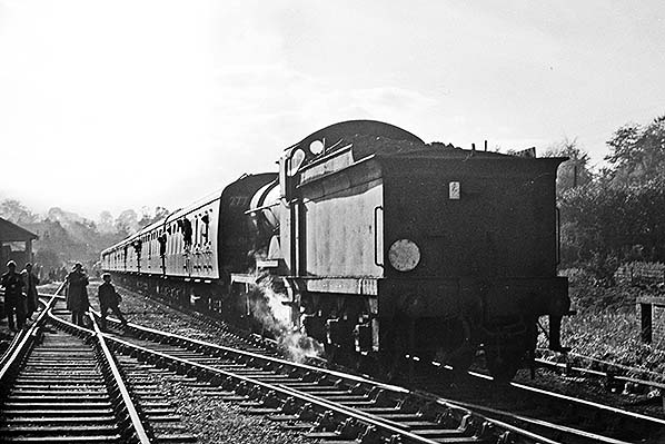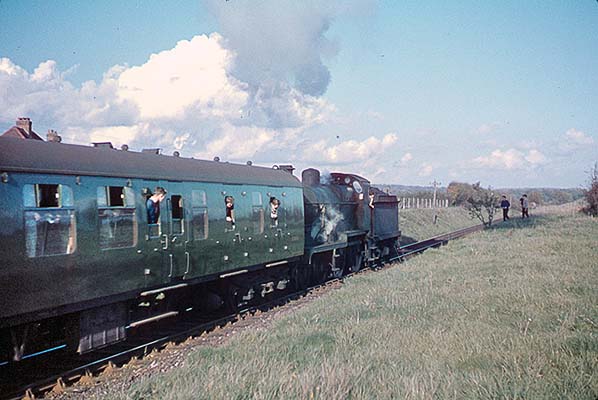 ![]() Class D1 4-4-0 No.31739 has arrived at Westerham on the final day of service. Details of these workings are not entirely clear. One source states that, on the final day, the usual push-pull train with Class H No.31518 operated during the morning and for the rest of the day services were operated by the main line stock seen above, with Bulleid Q1 No.33029 later taking over from the D1. However, confusion regarding precise details arises as a photograph has been seen showing the above train shunted into the loop to make way for No.31518 and her push-pull set. It therefore appears there was some overlap with No.31739 and her train making at least one run on the branch in addition to the timetabled services. Class D1 began life as a Belpaire rebuild of Class D and the type was normally seen on services to the Kent coast prior to electrification. At the time of the above photograph she was allocated to Bricklayers Arms and was withdrawn soon after the photograph was taken. The coaching stock is set 277. There were two such sets, both 10-car including an RB (Restaurant Buffet) and comprised mainly BR Mk1 stock. The other set was No.278 and the normal haunt of both was the Waterloo - Weymouth route. Note the open door on the non-platform side of the train and passengers walking where they should not. This was common practice in BR days when special trains operated and although officially prohibited it was tolerated on occasions such as above; otherwise a Track Pass was required and the issue of those often depended upon who one knew within the rail industry. Nowadays and, it has to be said, with some justification, one is prone to arrest for being beyond the bounds of permitted public access. On the right of the above view a single box van is stabled on the goods shed road.