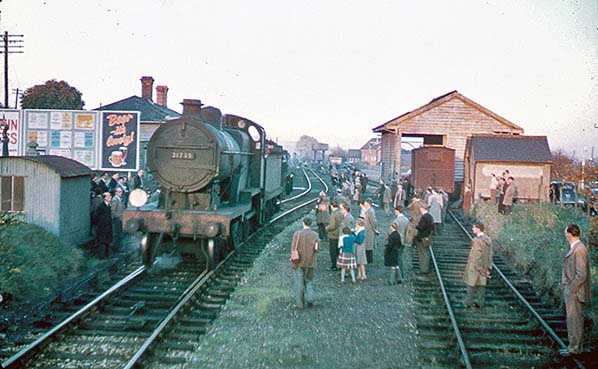 Photo from David Glasspool collection from Kent Rail web site ![]() A closer view of No.31739 on 28 October 1961, this train being the 3.01pm arrival having taken over from No.31518 and the push-pull set. Not a great deal of effort, if any, appears to have been put into smartening up No.31739 but, as colour images show, at least the coaching stock was clean. Not that a clean train in Southern unlined green was any more attractive than a dirty one, of course. Photographs show a lot of small children were at Westerham on the last day, as on the left of this image. One wonders what these children thought for, as anybody over a certain age will testify, standing next to a huge, to a small child, steam locomotive could be a frightening experience and especially when the safety valves suddenly lifted. For some children, however, standing near a hot, hissing, steam locomotive was a spellbinding experience akin to watching a science fiction film.