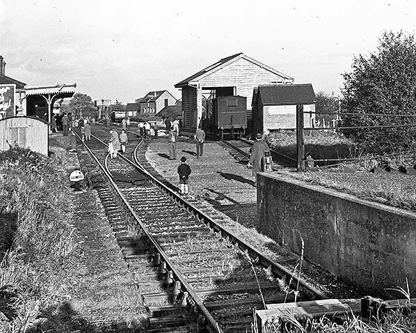 Photo by Ian Nolan from his Flickr photostream ![]() Another view taken on the last day of service, 28 October 1961, this time looking east from the buffers. Regretfully much detail has been obscured by the enthusiasts. In almost all images showing people on the track, the number of young children present is of note. Some would have been local, others would have travelled from elsewhere, but all would have almost certainly been with a parent to witness the end of the Westerham branch although the small boy ahead of the camera appears a little lost. After closure and during the ultimately abortive preservation scheme the goods shed, centre right, was used as a shed for the 'Railmobile' contraption described elsewhere. The building in front of the goods shed was by this time being used as a cement store.