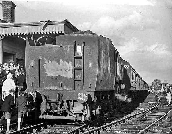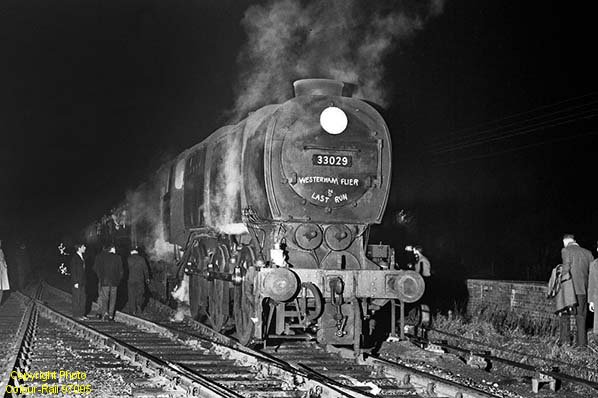 a number of pages. Photo by Ian Nolan from his Flickr photostream ![]() Saturday 26 October 1961 and the inscription on the smokebox door of Bulleid Q1 No.33029 speaks for itself although this was actually the penultimate run rather than the last run. The location may not be immediately obvious; it is the east end of Westerham station and the locomotive has run round ready for the return journey to Dunton Green. The Bulleid Q1 was an austerity locomotive built solely for use on the Southern Railway during the Second World War. The Southern, it must be remembered played a crucial role in wartime transport serving as it did the Kent ports. Introduced in 1942, a total of 40 were built with construction split equally between Brighton and Ashford Works. Said to have been the most powerful 0-6-0 type ever to have run in Britain, the type was devoid of many embellishments such as running plates and splashers. Wheels were of the Bulleid Firth Brown type. Boiler casing was in three sections of differing dimensions as can be seen above and in cross-section resembled the cross-sectional profile of Bulleid's coaching stock. Be that as it may, the design of the Q1 boiler casing came about partly because of the type of lagging used (lagging is located between outer casing and boiler proper) which in this case is believed to have been fibreglass. Behind the bufferbeam the two inside cylinders can just be made out and the two smaller cylinders above them are the valve gear. Not immediately obvious in the above view is the steep slant at which the valve gear was set. When new, the class was originally given Bulleid's peculiar numbering system and 33029 began life numbered C29, with the C representing three driving axles. This was simple enough but the larger the locomotive the more odd the system became. The Bulleid Pacifics (4-6-2) for example had a 21C XXX system with the 'XXX' being the actual number. 21C represented 2 leading bogie axles, 1 trailing pony axle and three driving axles. The final members of the class bowed out in 1966 with No.33029 herself going in January 1964. One, the first of the class No.33001 (C1 when new), survived into preservation. One irony, given that the class was of wartime origin, is that they had a slightly German look about them. This was most noticeable when viewed from the front and rear. Click here for a close-up of the front of No.33029.