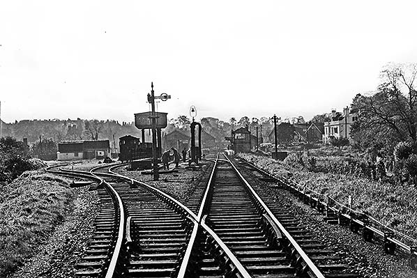 Westerham Station Gallery 9: Last Day - August 1962 ![]() Another last day of service view of Westerham but from a refreshingly different angle. The camera is looking south-west from the points giving access to the goods yard. The station is beyond the signal box in the distance. The rear of the ringed shunt signal arm was white. In the centre of the image the water crane can be seen with the water tower to its left. Adjacent to the water tower the Southern brakevan seen in the view above is visible in other. Goods wagons would have been removed from the branch soon after the final passenger train had ran. This view was taken after the departure of the 3.23pm service to Dunton Green.