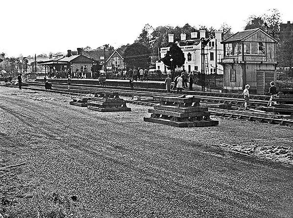 Photo by Ian Nolan from his Flickr photostream ![]() A view north-west towards Westerham station from the goods yard on the final day of service, 28 October 1961, and with the obligatory piles of sleepers on view. Among the enthusiasts are some young children; even with no train present railway tracks are dangerous places for children and indeed adults who have had no formal railway training. The starting signal is 'off', suggesting the 3.23 pm service to Dunton Green has recently departed. In the background the Westerham Primary School can be seen, left of centre, and the Crown Hotel, left of the signal box.