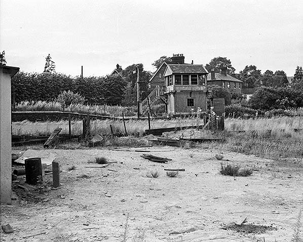 ![]() The rather scruffy Stevens signal box, with Southern starting signal, on 28 October 1961. The small hut to the right was for ablution purposes. Had the branch seen the proposed electrification and survived, the scene here today would comprise just a single track and a colour-light signal, while the photographer would be standing in the fruit and veg section of a supermarket!