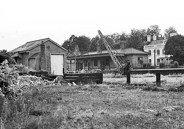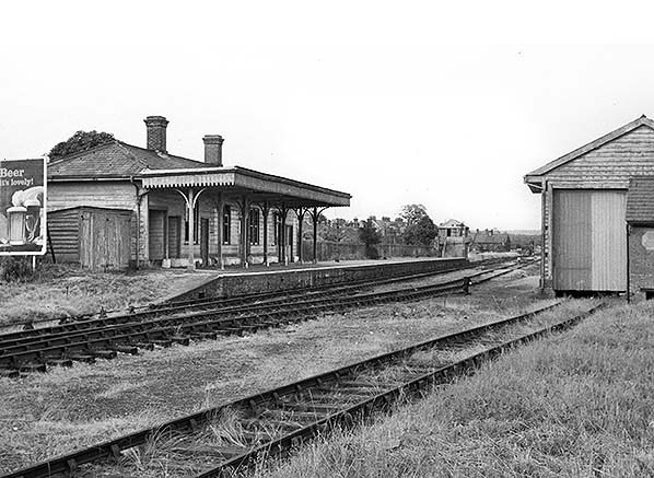 Photo by Ted Burgess ![]() An August 1962 view across the goods yard with the station building in the background. Some fittings had been removed from the station and grass is growing in the area of the track but generally it would to difficult to realise that the line had closed ten months previously. The Crown Hotel stands in the right background and would continue to do so until 1990.