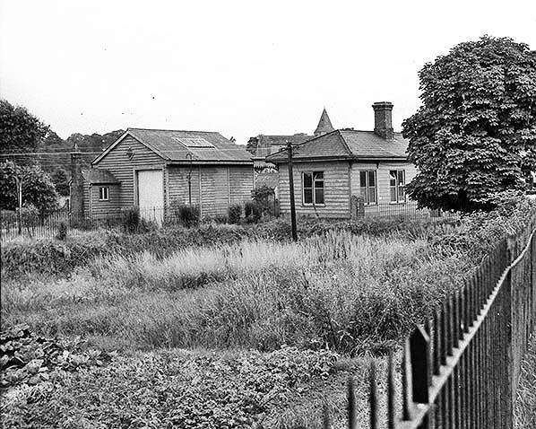 Westerham Station Gallery 10: August 1962 - Late 1962 ![]() An August 1962 view of a disused Westerham station and goods shed from the east end of the forecourt. A lamp standard can be seen beside the goods shed but minus lamp and thus indicative of the fittings removed following closure. Telegraphs wires had, however, been left intact as seen above as had all signalling equipment and most of the track. One suspects that what had happened was BR began to dismantle the line but ceased when the preservationists took steps towards taking over. But preservationists aside, it was common BR practice to remove fixtures and fittings from stations soon, or immediately, after closure and commence track-lifting at a later date. The platform runs in front of the station building, right, but is hidden by undergrowth. In the background the distinctive, albeit rather plain, spire of St Mary the Virgin church can be seen.