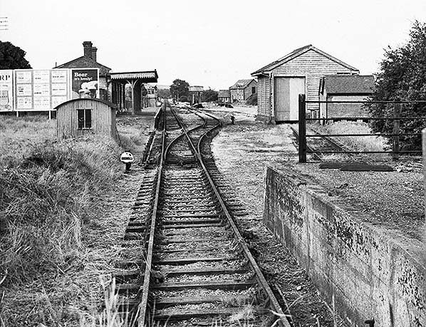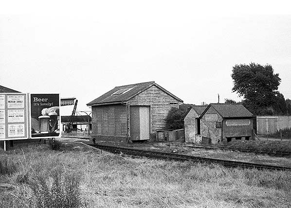 Photo by Ian Nolan from his Flickr photostream ![]() Looking north-east towards the water tower from the goods yard in August 1962. The signal box and station are out of view to the left. At far left a shunt signal can just be seen but under magnification its disc appears to be upside-down for some mysterious reason. Also visible are some stacks of sleepers; a feature which appears to have been ever-present during the final years of the branch and subsequently. The water crane is visible to the right of the water tower while in the background are the houses of Madan Road. The stationmaster lived at No. 46 which is the last house visible.
